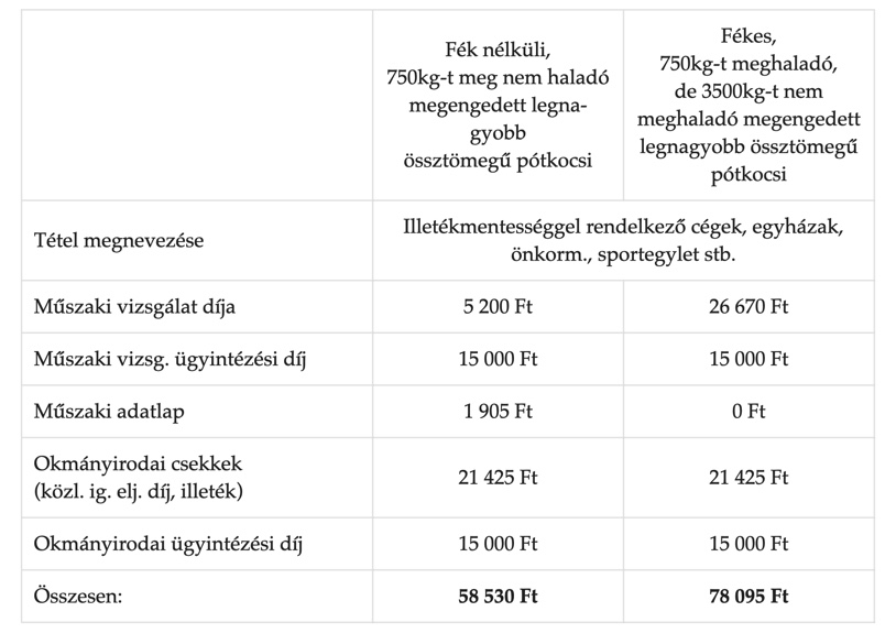 Az utánfutó forgalomba helyezésének költségei minden olyan tételt tartalmaznak, amely szükséges ahhoz, hogy az utánfutó az átadáskor jogszerűen részt vehessen a közúti forgalomban: